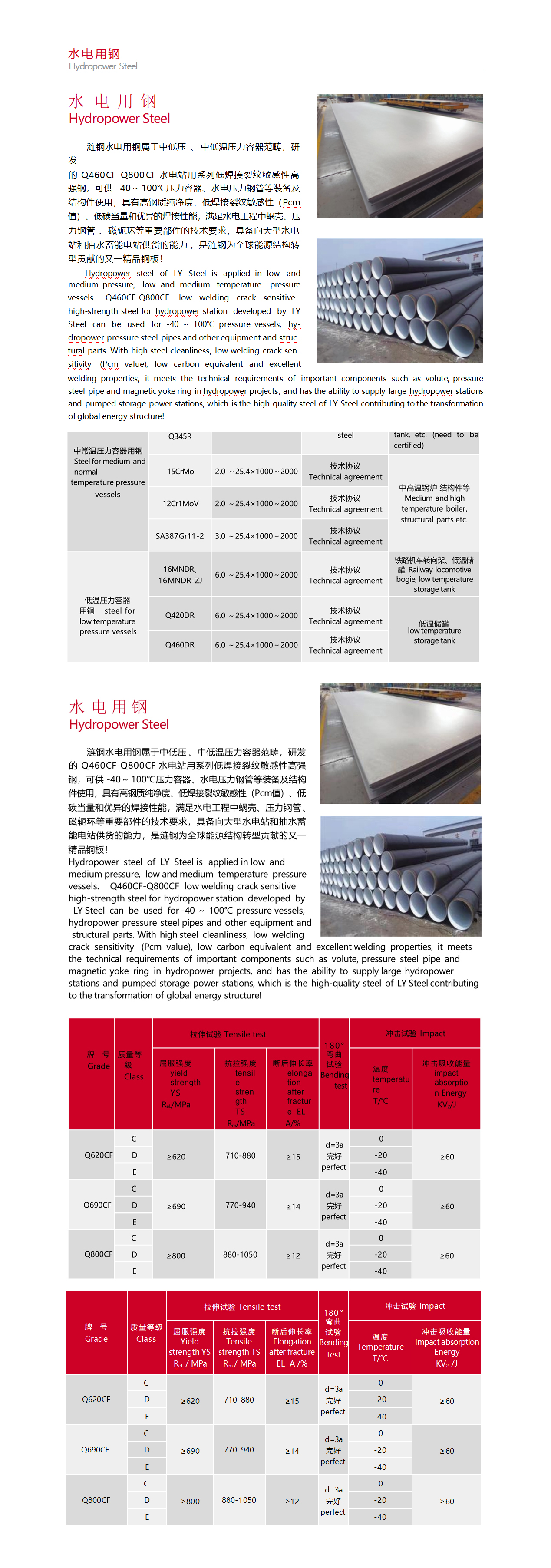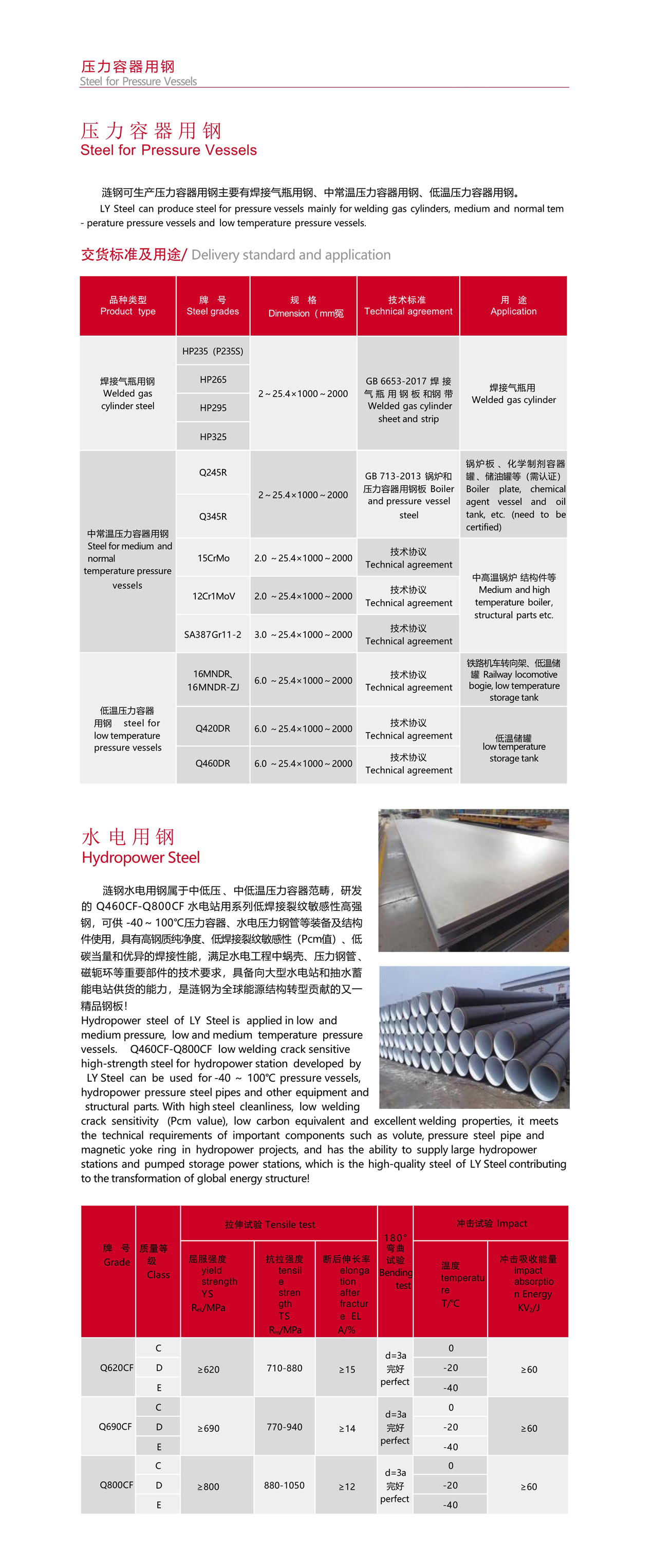 漣鋼水電用鋼屬于中低壓 、中低溫壓力容器范疇,研發(fā)的 Q460CF-Q800CF 水電站用系列低焊接裂紋敏感性高強(qiáng)鋼,可供 -40~ 100℃壓力容器、水電壓力鋼管等裝備及結(jié)構(gòu)件使用,具有高鋼質(zhì)純凈度、低焊接裂紋敏感性(Pcm值)、低碳當(dāng)量和優(yōu)異的焊接性能,滿足水電工程中蝸殼、壓力鋼管 、磁軛環(huán)等重要部件的技術(shù)要求,具備向大型水電站和抽水蓄能電站供貨的能力,是漣鋼為全球能源結(jié)構(gòu)轉(zhuǎn)型貢獻(xiàn)的又一精品鋼板!