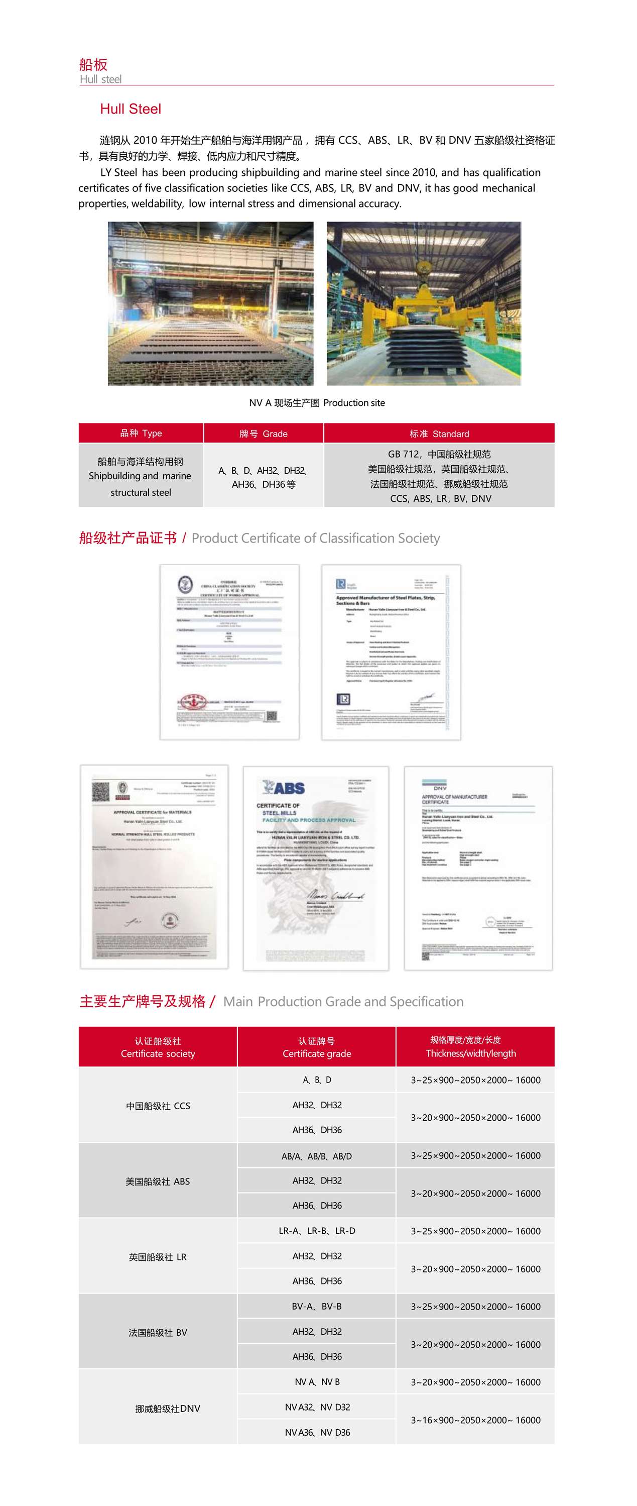 漣鋼從 2010 年開始生產(chǎn)船舶與海洋用鋼產(chǎn)品 ,擁有 CCS、ABS、LR、BV 和 DNV 五家船級社資格證 書,具有良好的力學(xué)、焊接、低內(nèi)應(yīng)力和尺寸精度。