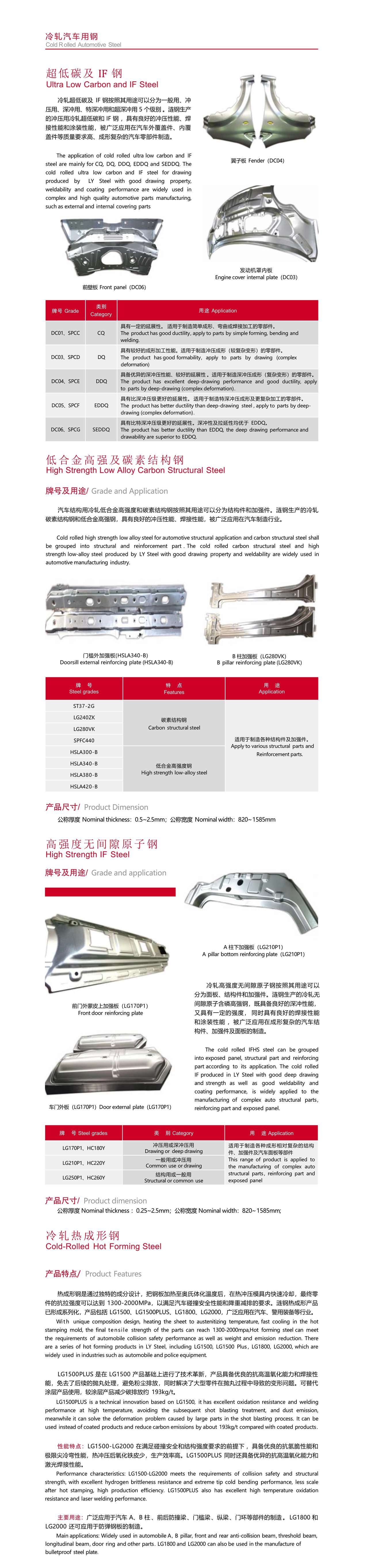 冷軋超低碳及 IF 鋼按照其用途可以分為一般用、沖 壓用、深沖用、特深沖用和超深沖用 5 個級別 。漣鋼生產(chǎn) 的沖壓用冷軋超低碳和 IF 鋼 ,具有良好的沖壓性能、焊 接性能和涂裝性能,被廣泛應(yīng)用在汽車外覆蓋件、內(nèi)覆 蓋件等質(zhì)量要求高、成形復(fù)雜的汽車零部件制造。