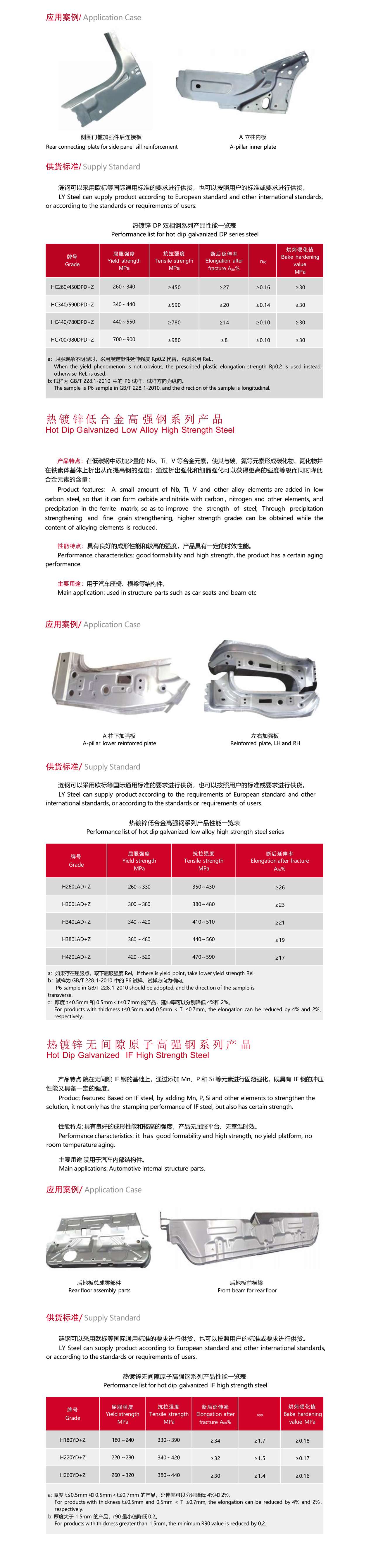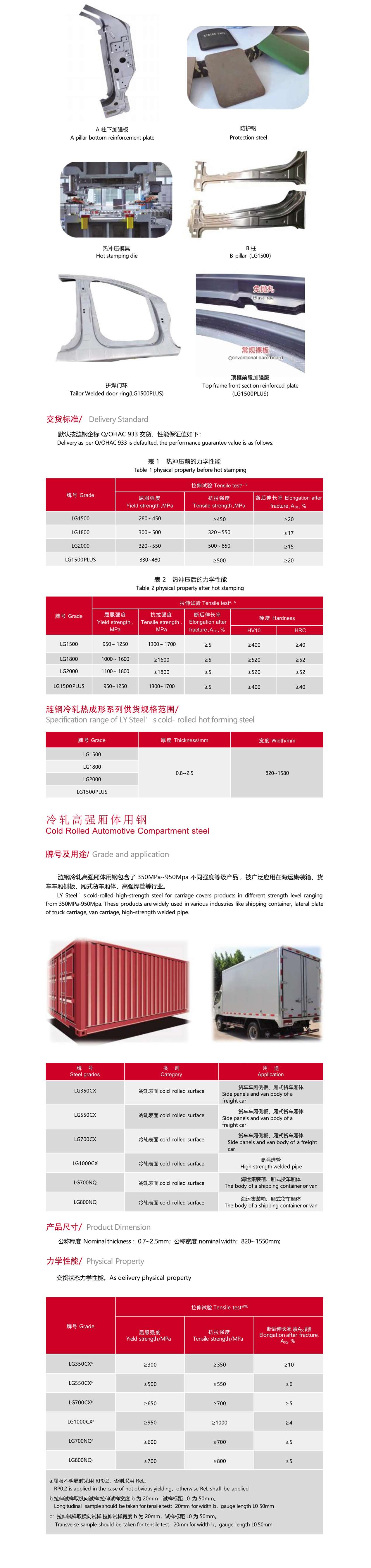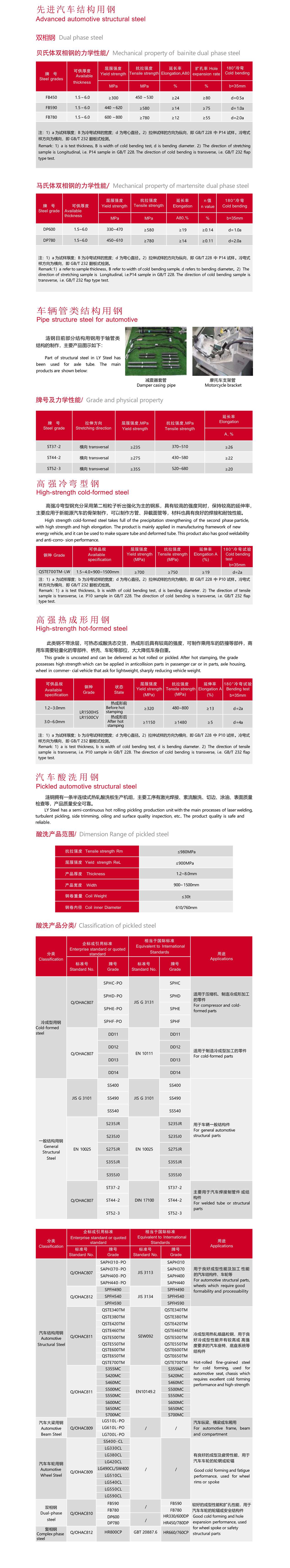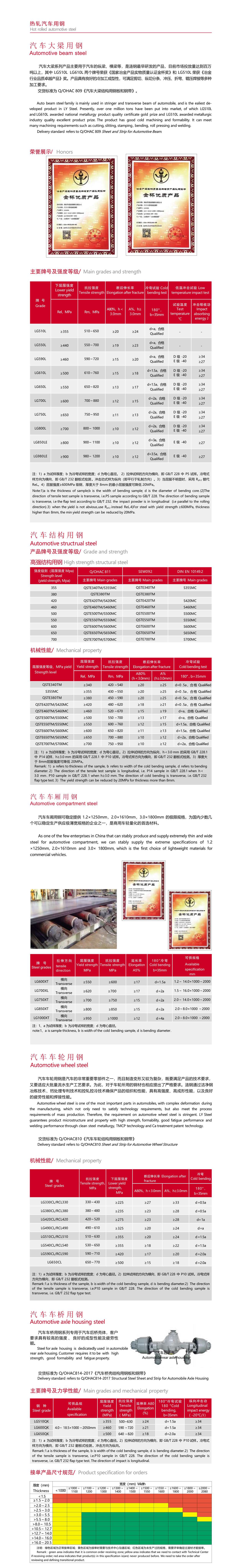 汽車大梁系列產(chǎn)品主要用于汽車的縱梁、橫梁等,是漣鋼最早研發(fā)的產(chǎn)品,目前市場投放量達(dá)到百萬 噸以上,其中 LG510L LG610L 兩個牌號榮獲《國家冶金產(chǎn)品實物質(zhì)量認(rèn)證金杯獎》和 LG510L 榮獲《冶金 行業(yè)品質(zhì)卓越產(chǎn)品》獎。產(chǎn)品具有良好的冷加工成型性,可滿足剪切、縱切分條、沖壓、折彎、輥壓焊接等多種 加工要求。