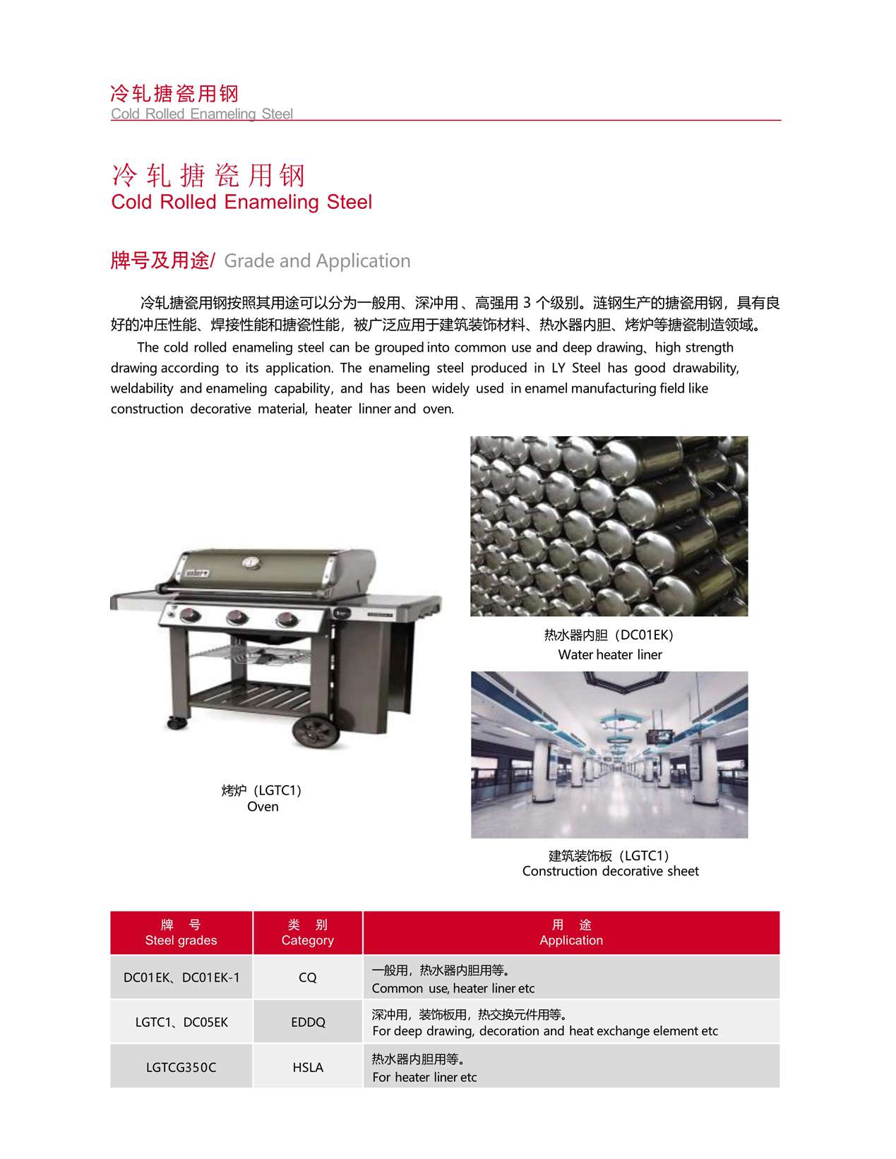 冷軋?zhí)麓捎娩摪凑掌溆猛究梢苑譃橐话阌?、深沖用 、高強(qiáng)用 3 個級別。漣鋼生產(chǎn)的搪瓷用鋼,具有良 好的沖壓性能、焊接性能和搪瓷性能,被廣泛應(yīng)用于建筑裝飾材料、熱水器內(nèi)膽、烤爐等搪瓷制造領(lǐng)域。