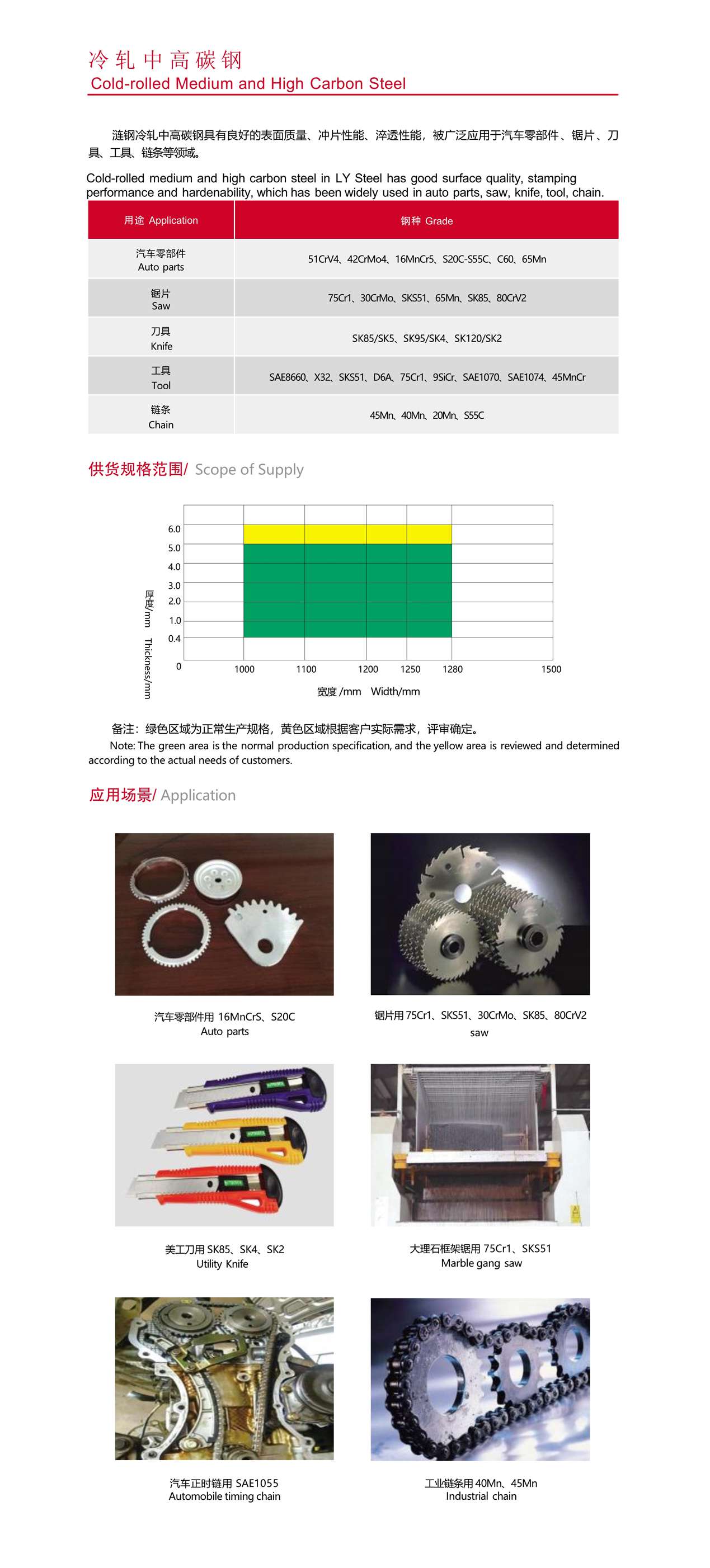 漣鋼冷軋中高碳鋼具有良好的表面質(zhì)量、沖片性能、淬透性能,被廣泛應(yīng)用于汽車零部件 、鋸片 、刀 具、工具、鏈條等領(lǐng)域。