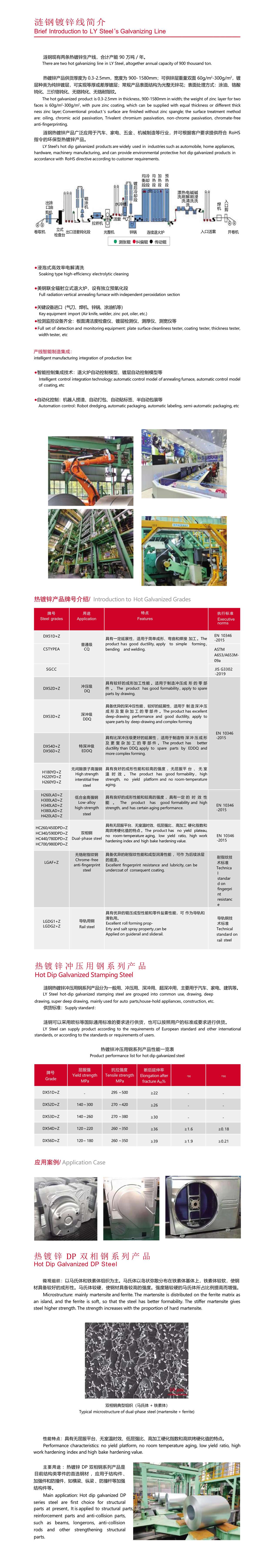 熱鍍鋅產(chǎn)品供貨厚度為 0.3-2.5mm,寬度為 900- 1580mm;可供鋅層重量雙面 60g/m2-300g/m2,鍍 層種類為純鋅鍍層,可實現(xiàn)等厚或差厚鍍層;常規(guī)產(chǎn)品表面結(jié)構(gòu)為光整無鋅花;表面處理方式:涂油、鉻酸 鈍化、三價鉻鈍化、無鉻鈍化、無鉻耐指紋。