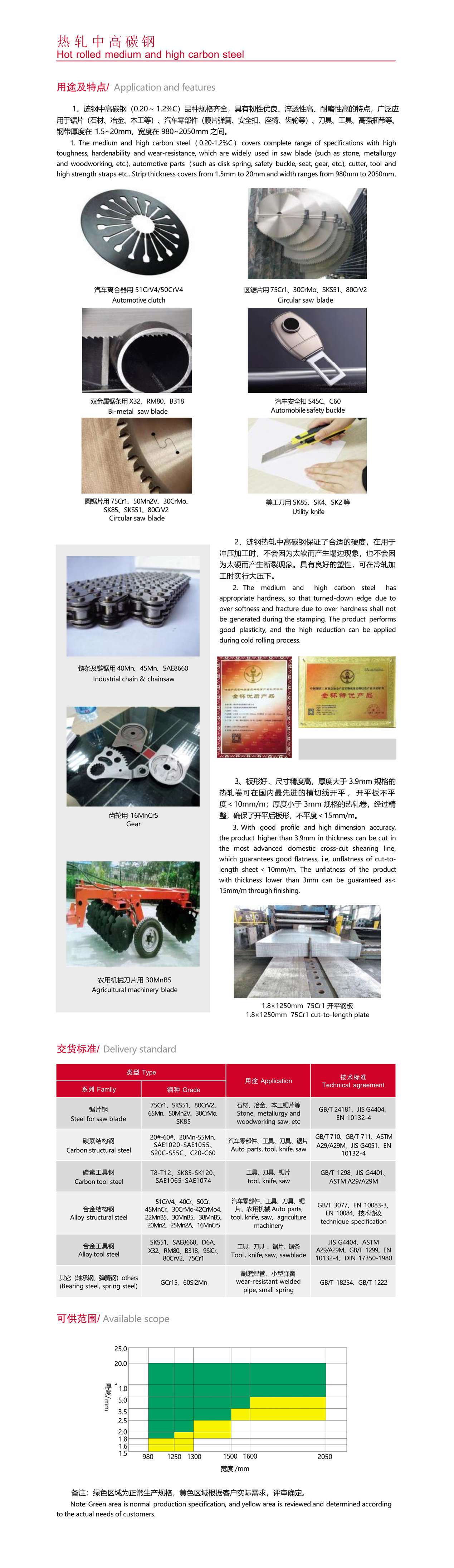 漣鋼中高碳鋼(0.20~ 1.2%C)品種規(guī)格齊全,具有韌性優(yōu)良、淬透性高、耐磨性高的特點,廣泛應(yīng) 用于鋸片(石材、冶金、木工等)、汽車零部件(膜片彈簧、安全扣、座椅、齒輪等)、刀具、工具、高強(qiáng)捆帶等。 鋼帶厚度在 1.5~20mm,寬度在 980~2050mm 之間。
