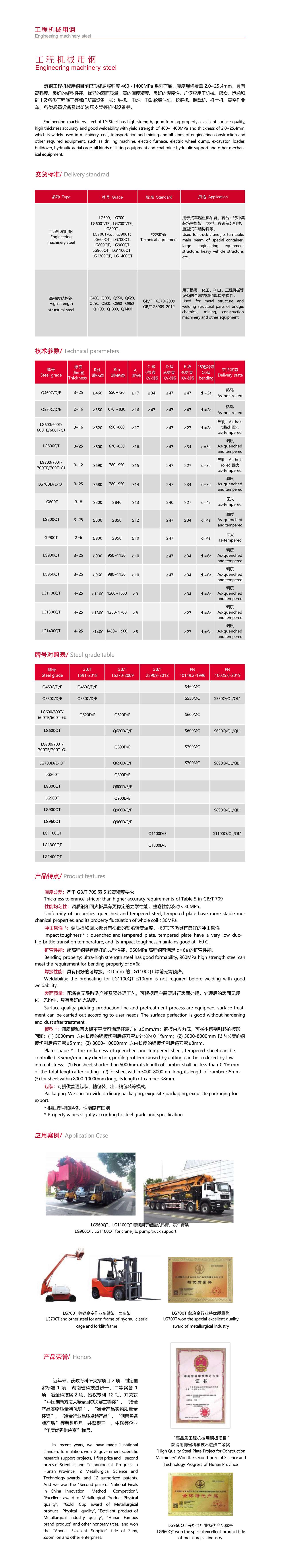 漣鋼工程機(jī)械用鋼目前已形成屈服強(qiáng)度 460~ 1400MPa 系列產(chǎn)品,厚度規(guī)格覆蓋 2.0~25 .4mm,具有 高強(qiáng)度、良好的成型性能、優(yōu)異的表面質(zhì)量、高的厚度精度、良好的焊接性。廣泛應(yīng)用于機(jī)械、煤炭、運(yùn)輸和 礦山及各類工程施工等部門所需設(shè)備,如:鉆機(jī) 、電爐、電動輪翻斗車 、挖掘機(jī)、裝載機(jī)、推土機(jī)、高空作業(yè) 車、各類起重設(shè)備及煤礦液壓支架等機(jī)械設(shè)備等。