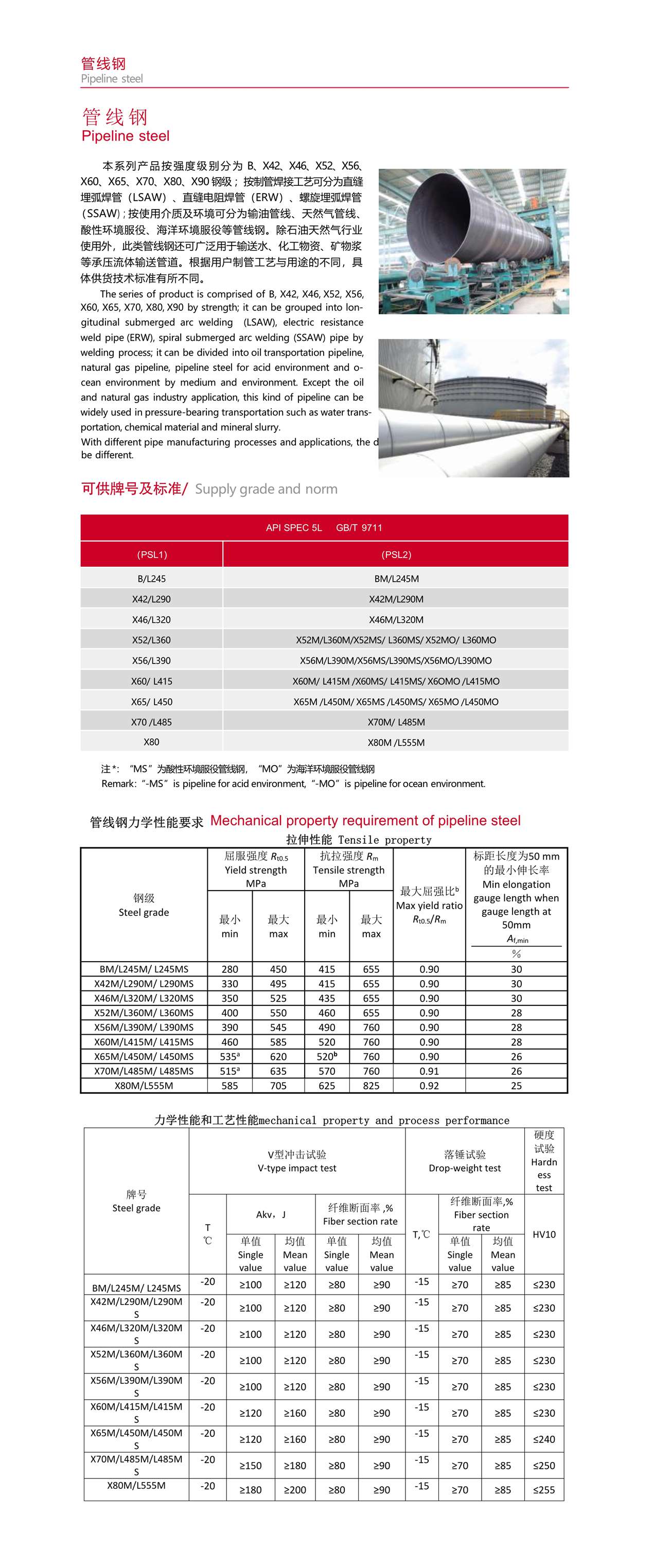 本 系 列 產(chǎn) 品 按 強(qiáng) 度 級 別 分 為 B、X42、X46、X52、X56、X60、X65、X70、X80、X90 鋼級 ;按制管焊接工藝可分為直縫埋弧焊管(LSAW)、直縫電阻焊管(ERW)、螺旋埋弧焊管(SSAW);按使用介質(zhì)及環(huán)境可分為輸油管線、天然氣管線、酸性環(huán)境服役、海洋環(huán)境服役等管線鋼。